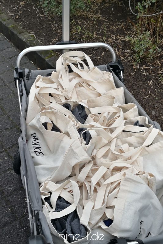 Für die Übergabe sollten die Jacken ja gut transportiert werden. Jede in eine Plastiktüte stecken kam für mich nicht in Frage. So bestickte ich für jeden einen eigenen Jutebeutel.